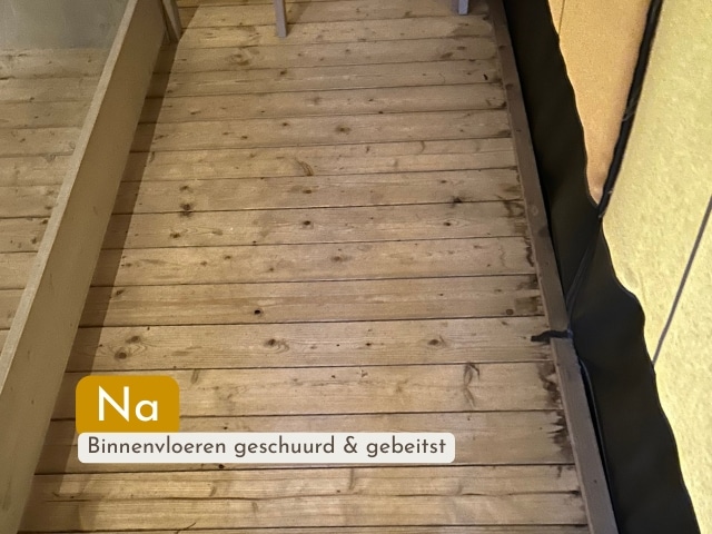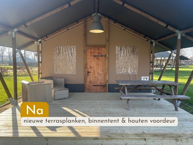 Bij tien Wood AN5 tenten voerden wij een technische refurbishment uit, waarbij binnententen werden vervangen, vloeren geschuurd en gebeitst, terrasplanken vernieuwd en de bestaande Douglas deuren werden aangepast en herplaatst.