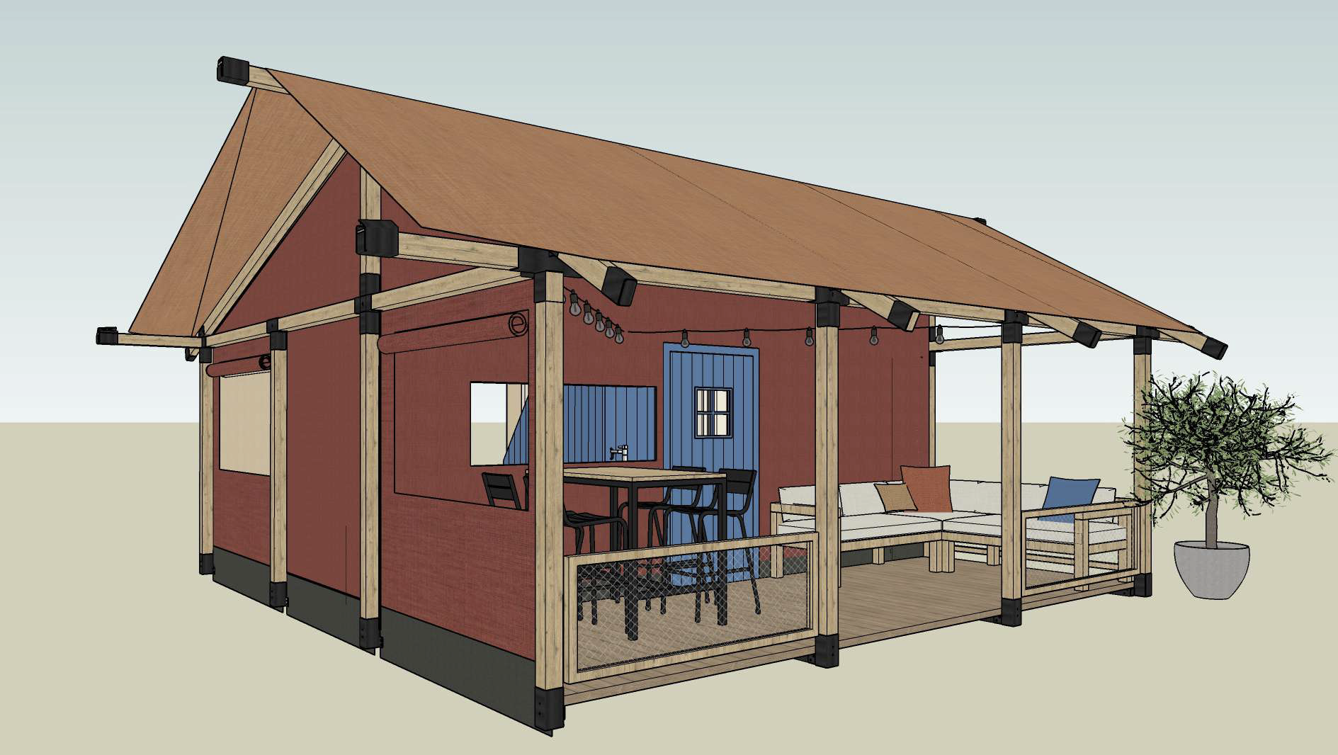 Door het opvallende steenrode canvas en terracotta dak is de Wander Lodge een echte eye-catcher. Het frisse design onderscheidt zich van traditionele safaritenten, waardoor de Wander Lodge een bijzondere uitstraling krijgt die uw gasten zal verrassen en aantrekken.